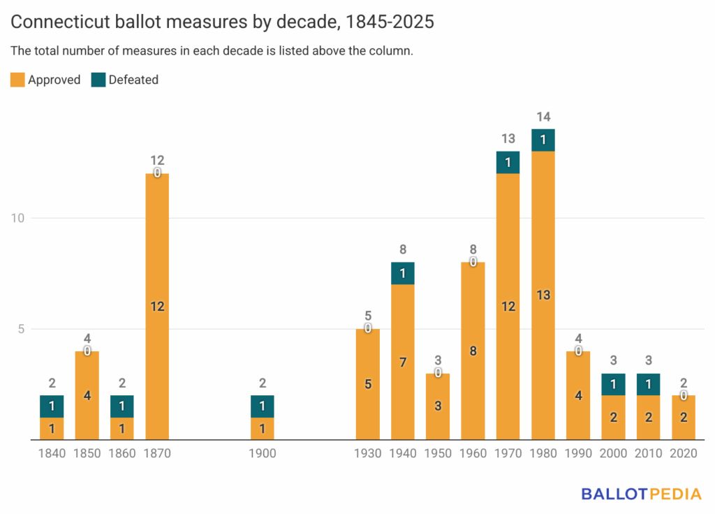 On average, Connecticut voters have decided on roughly five ballot measures per decade. The 1980s had the most ballot measures within a single decade, with 14. Of these, 13 (93%) were approved and one (7%) was defeated. The decades with the highest approval rate (all at 100%) were the 1850s (four measures), 1870s (12 measures), 1930s (five measures), 1950s (three measures), 1960s (eight measures), and the 2020s (two measures). The decades with the lowest approval rate (all at 50%) were the 1840s, 1860s, and the 1900s.