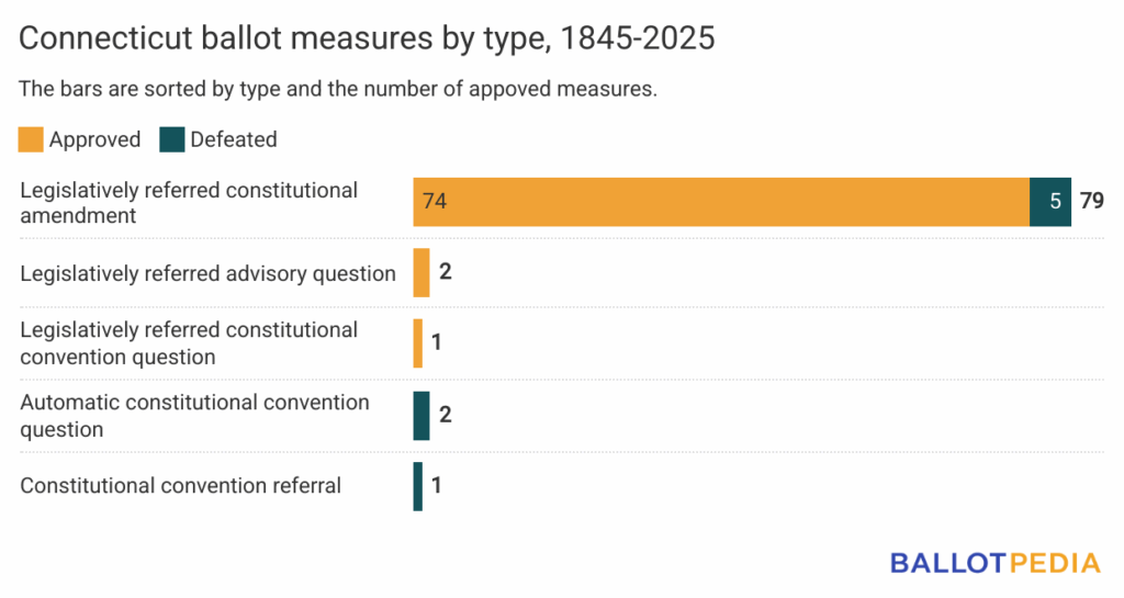While the majority of ballot measures have been legislatively referred constitutional amendments — with a total of 79 of 85 (93%) measures — Connecticut residents have also voted on two advisory questions; two automatic constitutional convention questions; one legislatively referred constitutional convention question; and one constitutional convention referral.