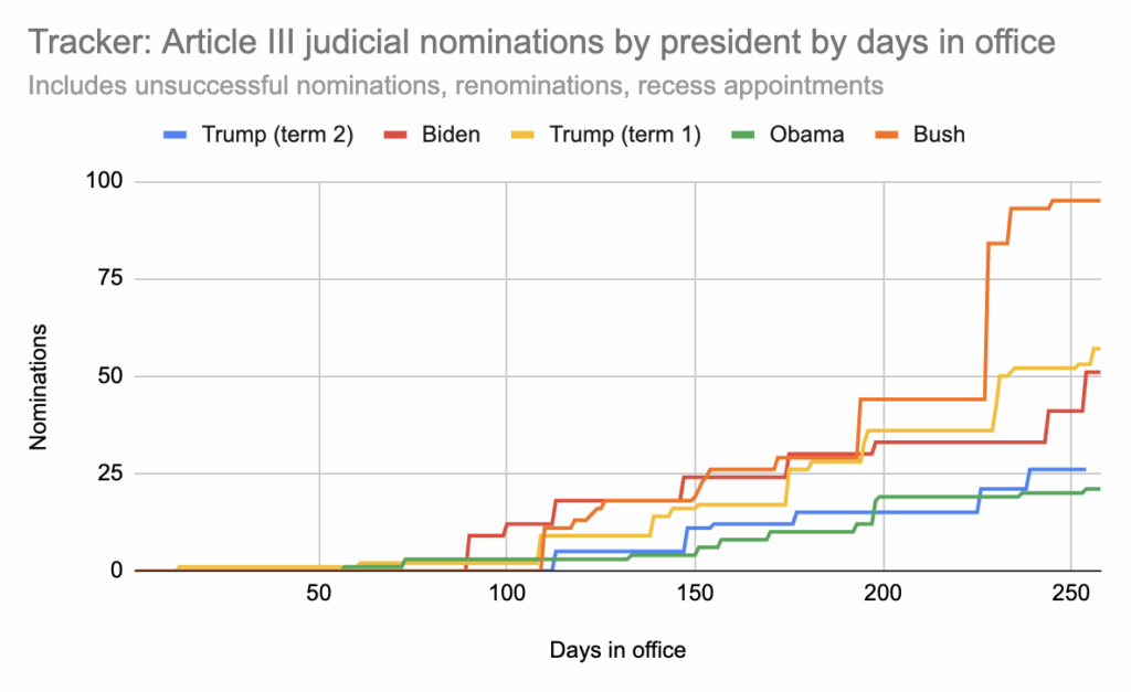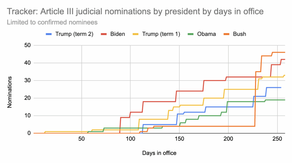 The following data visualizations track the number of Article III judicial nominations by president by days in office during the Biden, Trump, Obama, and W. Bush administrations (2001-present).
