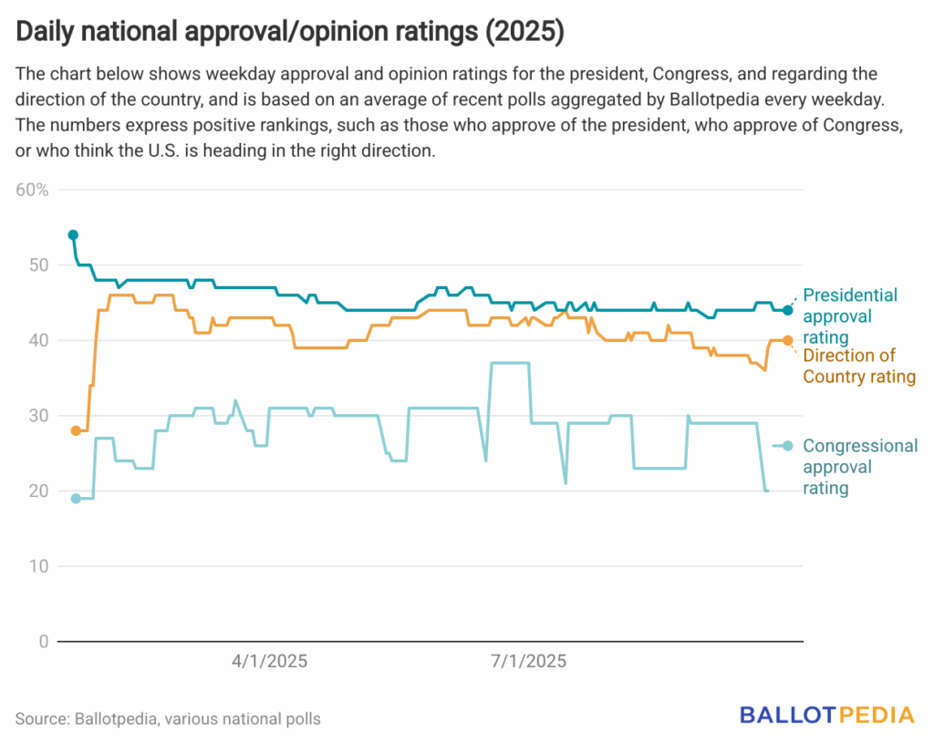 At the end of September, approval polling averages showed President Donald Trump (R) at 44% approval. Fifty-four percent of voters disapproved of his performance. In early September, Trump received a 43% approval rating, the lowest of his second term. The highest approval rating Trump has received this term is 54%, last seen on Jan. 22, 2025.