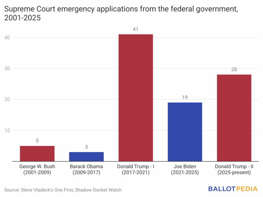 The second Trump administration has filed more emergency applications (28, including withdrawn applications) than the Bush, Obama, and Biden administrations combined (27). During Trump’s first term, his administration filed 41 emergency applications with the court.