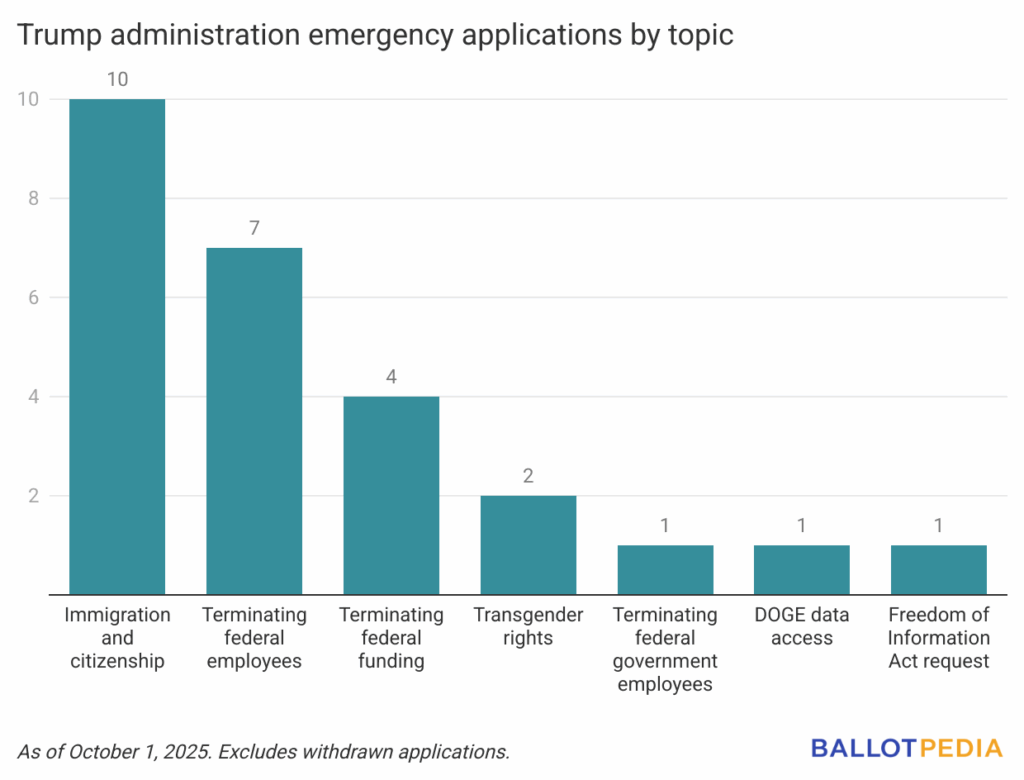 As of Oct. 1, 2025, the U.S. Supreme Court had fully granted 19 of the Donald Trump (R) administration’s emergency applications for intervention in lower court cases, 83% of the decided emergency applications that the administration filed. The court granted in part and denied in part two applications, denied one application, and denied one other application as moot.