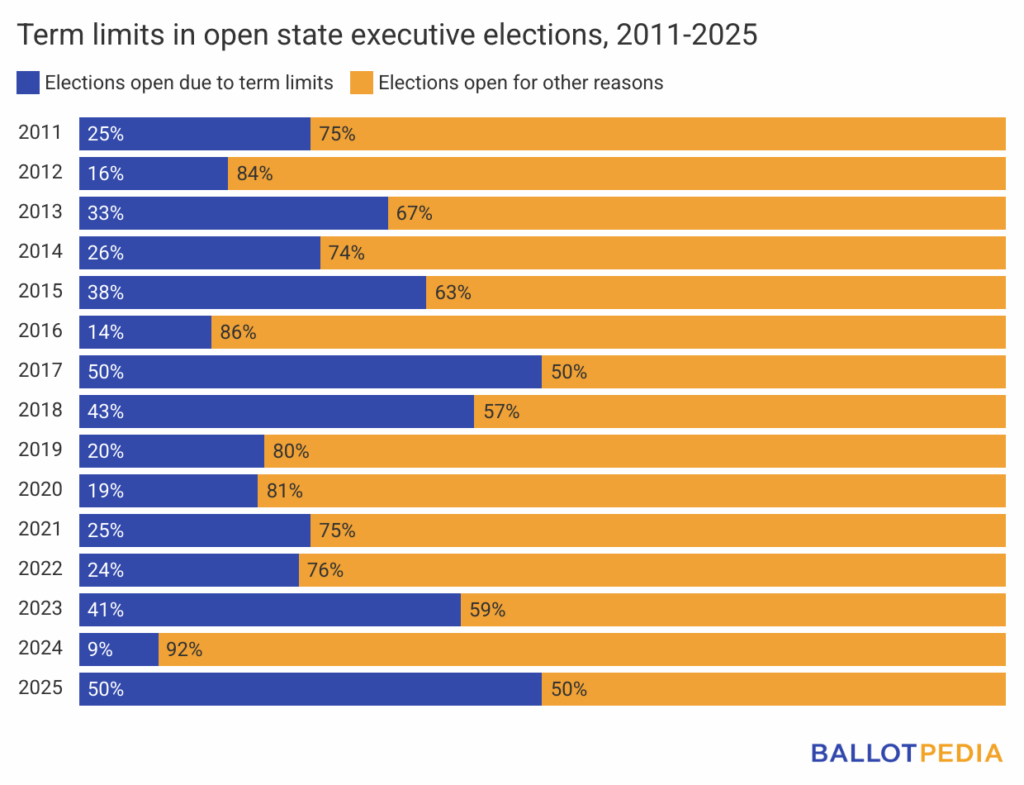 Of the four open state executive offices in 2025, two of them (25% of the eight total offices up for election) occurred because of term limits.