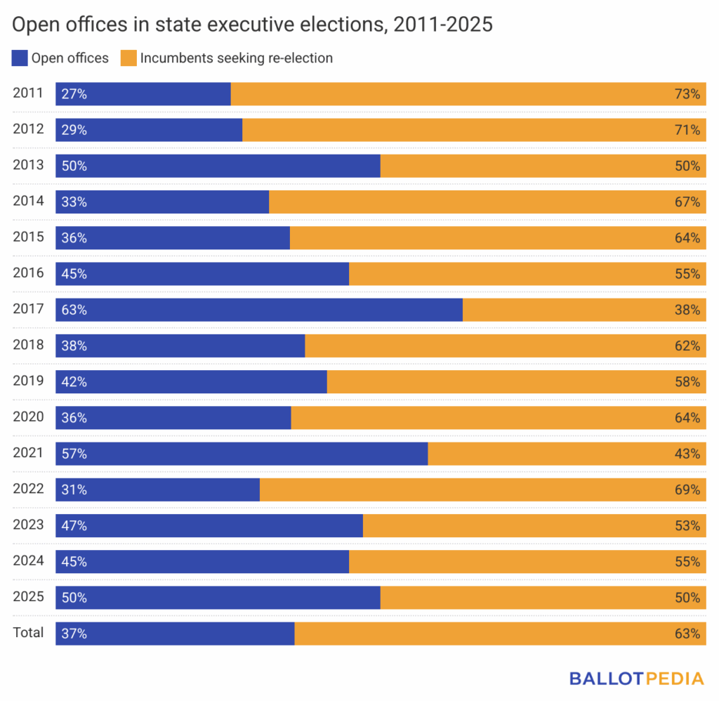 In 2025, four out of the eight state executive offices up for election have no incumbent running, meaning those positions are open. About 42% of these offices were open in odd-year elections from 2011 to 2023, while roughly 58% featured incumbents seeking another term. Elections tend to be more competitive when no incumbent is on the ballot.