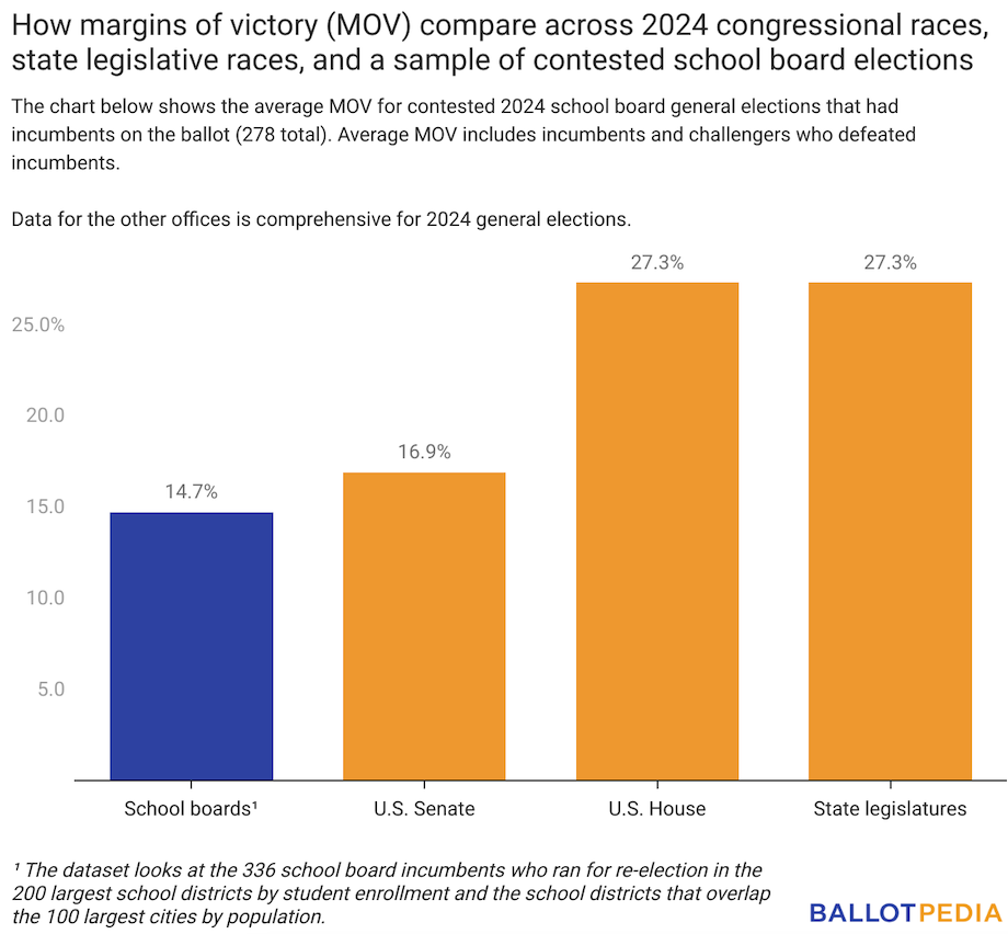 School board winners in the 337 contested elections—including both incumbents and challengers—won by narrower margins compared to those running in state legislative, U.S. House, and U.S. Senate elections.