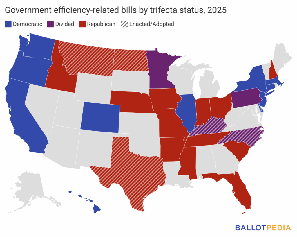 Ballotpedia has tracked 70 state bills related to government efficiency in 2025. As of Oct. 7, 11 of these bills were enacted, including Texas’ SB 14. Of these 11 bills: