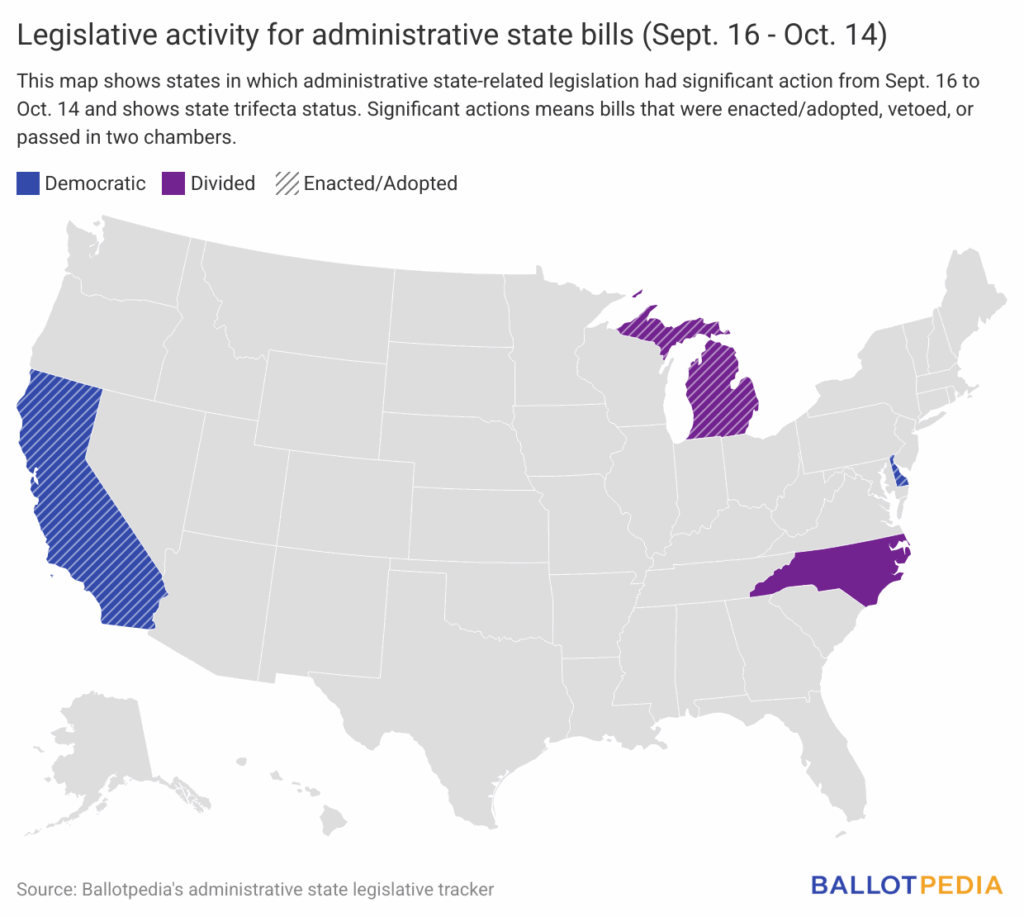 Since our last newsletter edition, Ballotpedia tracked significant legislative action (enactments, vetoes, and passage through both chambers) in four states on 30 bills related to the administrative state. Four states (CA, DE, MI, NC) enacted or adopted 24 bills; one state (CA) passed two bills in both chambers; California Governor Gavin Newsom (D) vetoed two bills and North Carolina Governor Josh Stein (D) vetoed