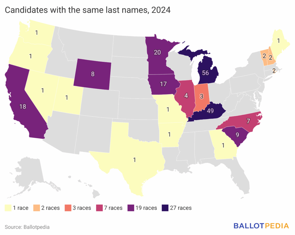 The number of elections and candidates meeting this criteria was higher in 2025 than in 2024, when 414 candidates across 206 elections in 22 states faced candidates with the same last name. Ten of these states also had an election in 2025: California, Georgia, Iowa, Maine, Minnesota, Michigan, North Carolina, South Carolina, Texas, and Washington. In 2024, the state with the most of these elections was Michigan, with 56, followed by Kentucky (49) and Minnesota (20). Iowa, the state with the second-highest number of elections in 2025, had the fifth-highest number of elections in 2024, with 17. The most common surname at the time was Smith, which appeared in five races.