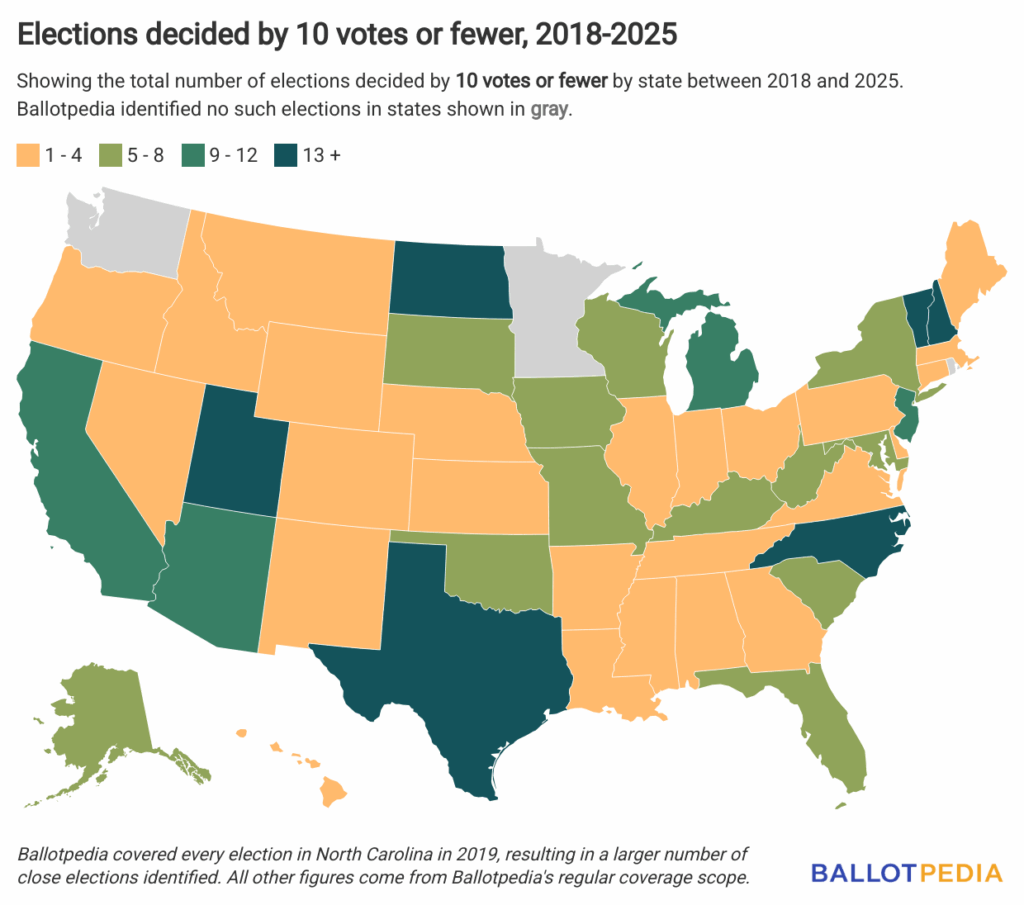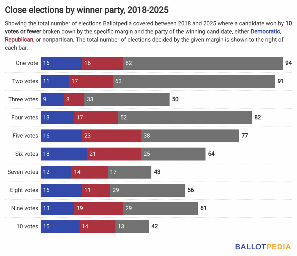 Thirty-four elections nationwide were decided by 10 votes or fewer between Sept. 2024 and Sept. 2025. Democrats won 11 of these elections, Republicans won five, and nonpartisan or minor party candidates won 18. Twenty-two of those were decided by 5 votes or fewer.