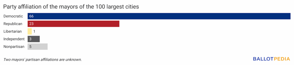 Currently, the mayors of 66 of the country’s 100 largest cities are Democrats. Republicans hold 23 mayoral offices, Libertarians hold one office, independents hold three, and five mayors are nonpartisan. Two mayors’ partisan affiliations are unknown.