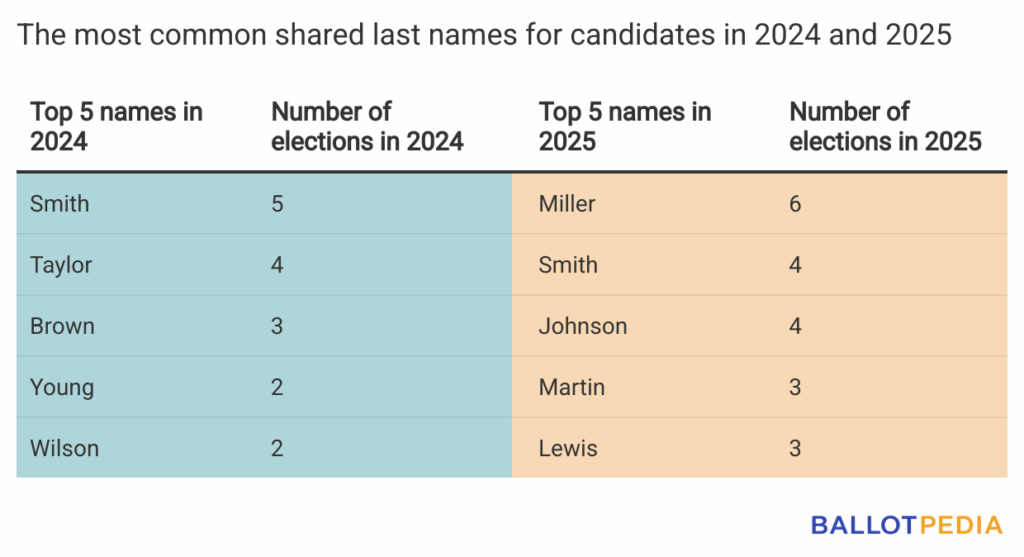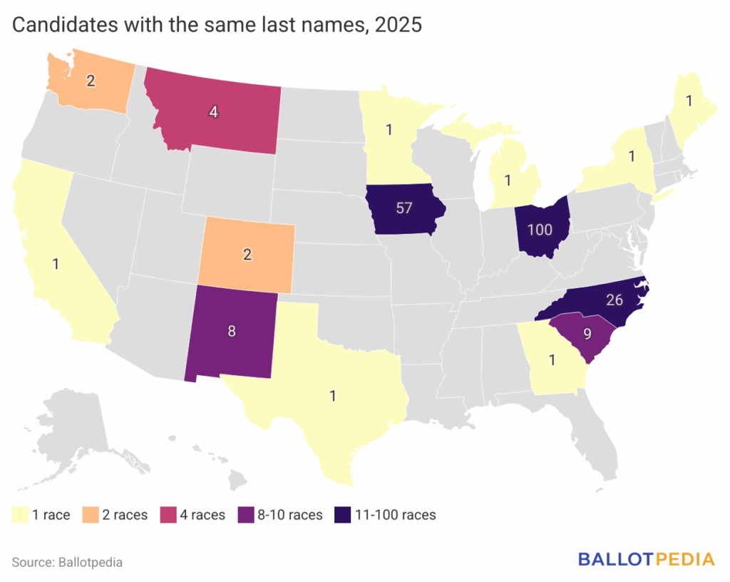 In 215 contests happening across 15 states in 2025, 438 candidates running for office share the same last name. All but one of these elections are nonpartisan. The partisan race is taking place in District 20 of the New York City Council between Allen Wang (Conservative Party), Steven Wang, and two other candidates.