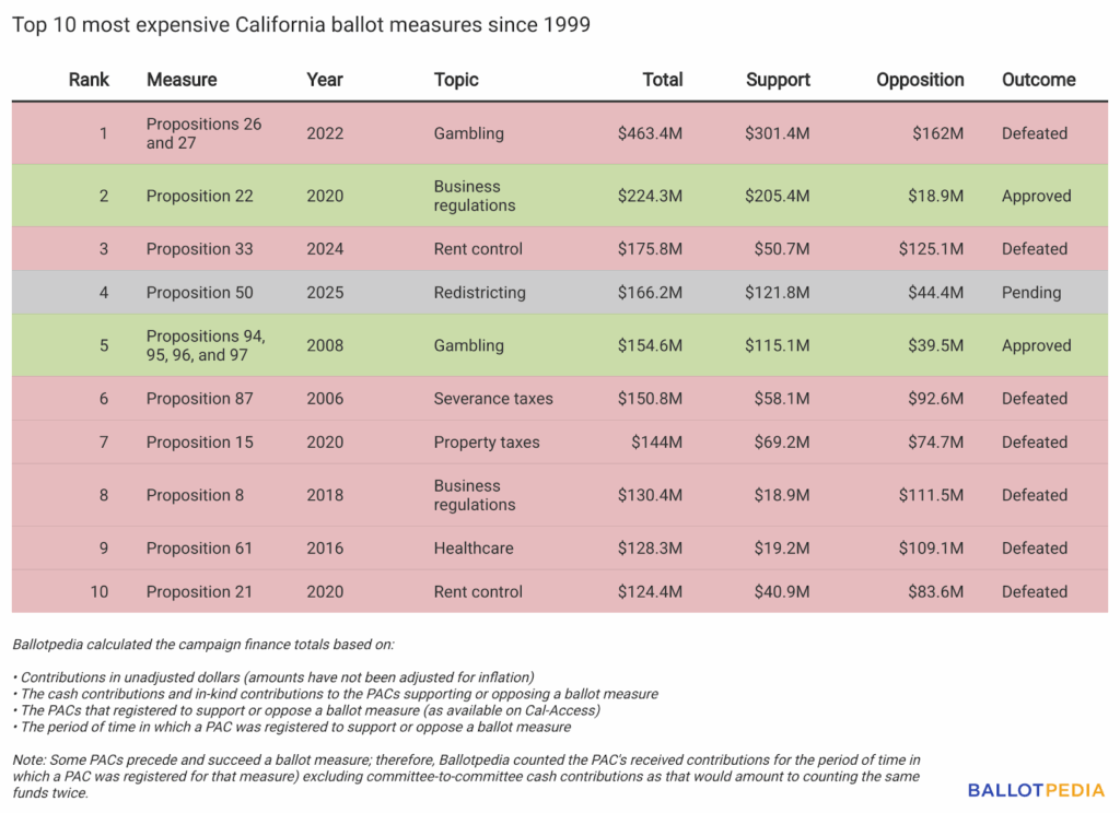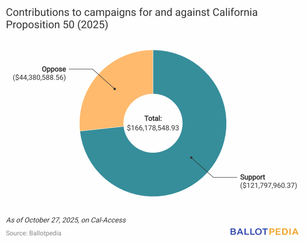 California Proposition 50 becomes the fourth most expensive ballot measure in state history, with $166.2 million between supporters and opponents