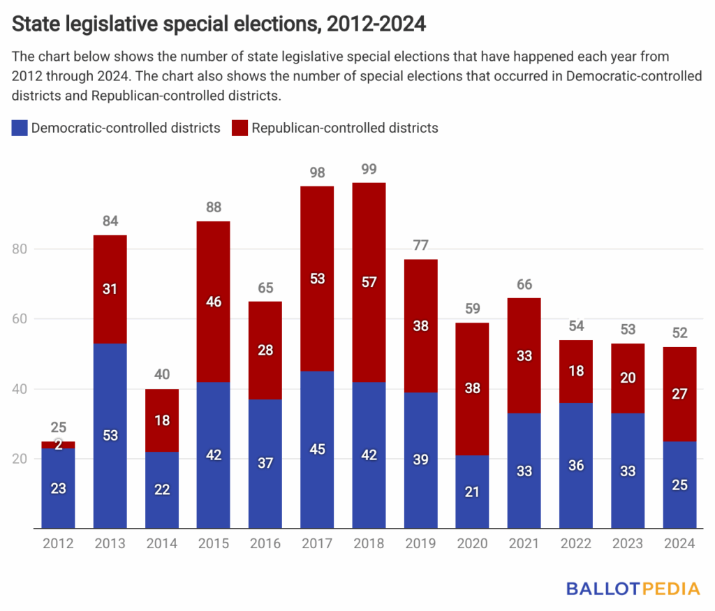 In 2024, five special state legislative elections resulted in changes in partisan control. Of those, Democrats won four and Republicans won one. As a result, in 2024, Democrats had a net gain of three seats and Republicans had a net loss of three seats.