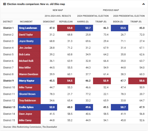 Ohio became the fourth state to redraw its congressional district boundaries ahead of the 2026 elections. On Oct. 31, 2025, the Ohio Redistricting Commission voted unanimously to approve a compromise map that, according to data from the commission based on recent statewide election results, could make two districts more competitive for Republicans.