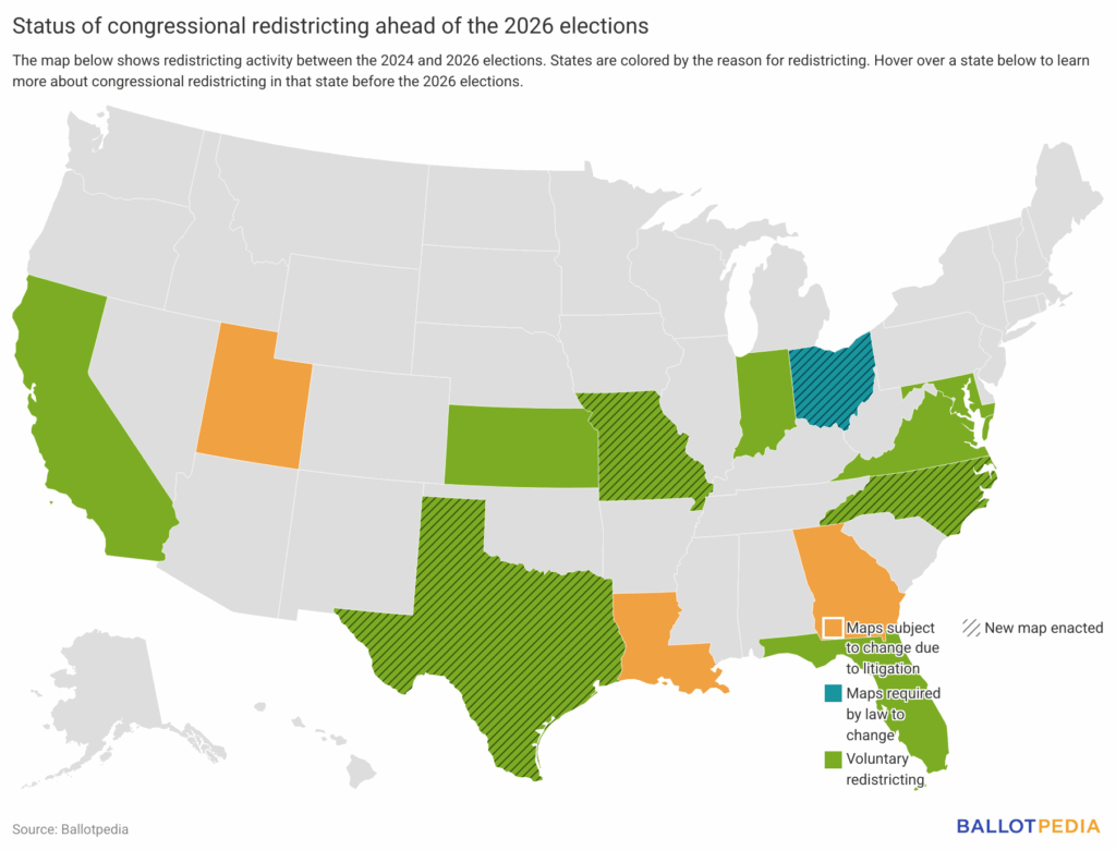 Counting Ohio Districts 1 and 9, redrawn maps nationwide could create nine new Republican-leaning districts. Voters in California will vote on Nov. 4, 2025, on whether to approve a constitutional amendment that would allow the adoption of a map designed to net four Democratic districts.
