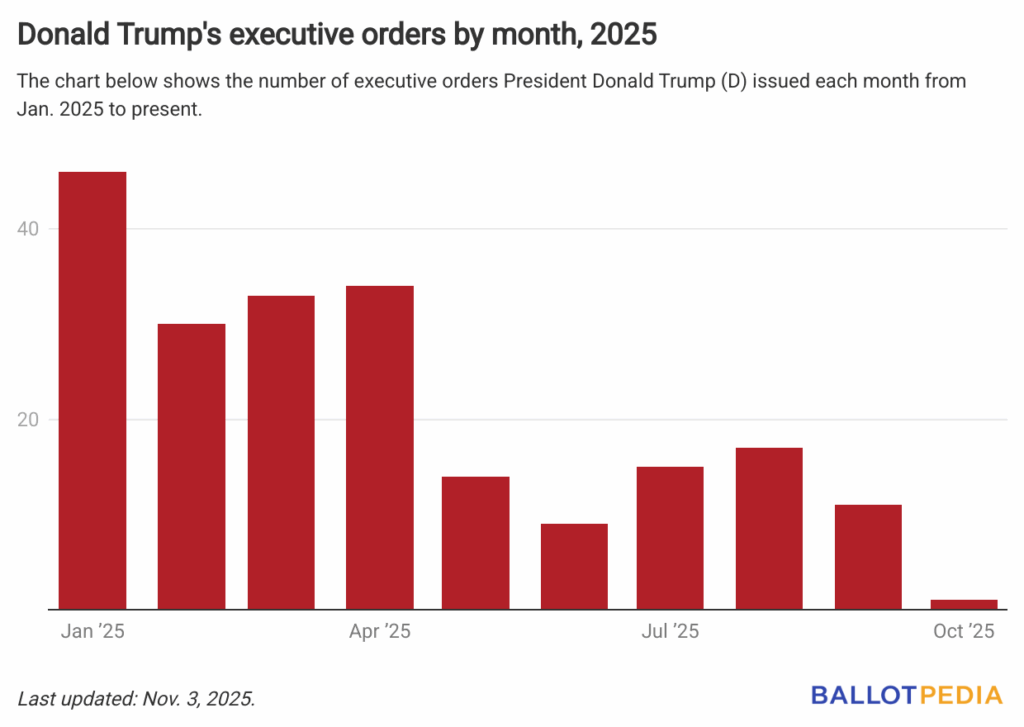 Trump issued ten fewer orders this month than he did in September, when he issued 11 executive orders. Trump issued 46 executive orders in January 2025, more than any other month of his presidency. In June 2025, Trump issued his second-lowest monthly total at nine orders.