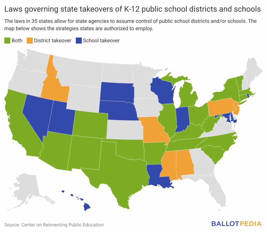 Thirty-five states have laws permitting the state to take over districts or schools. Between 1988 and 2023, agencies in at least 25 states assumed control of districts or individual schools. The first time a state assumed control of a school district was in 1989, when New Jersey took over Jersey City Public Schools following years of poor student performance and increasingly dilapidated buildings. Although the state had relinquished much of its control of the district by 2008, the takeover formally ended in 2022.