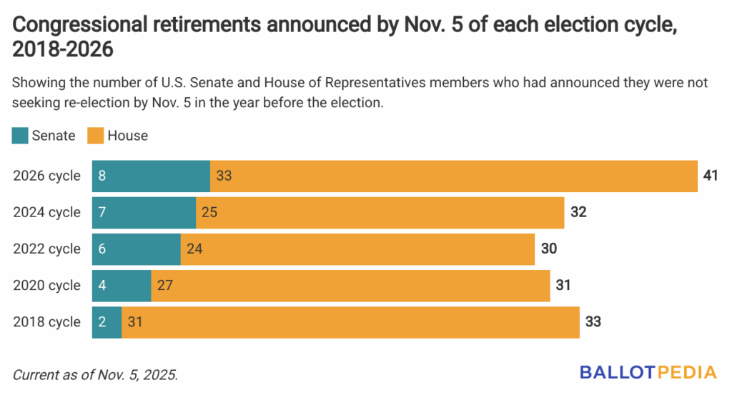Compared to the last four election cycles, there were 25 retirement announcements at this point in 2024, 24 in 2022, 27 in 2020, and 31 in 2018.