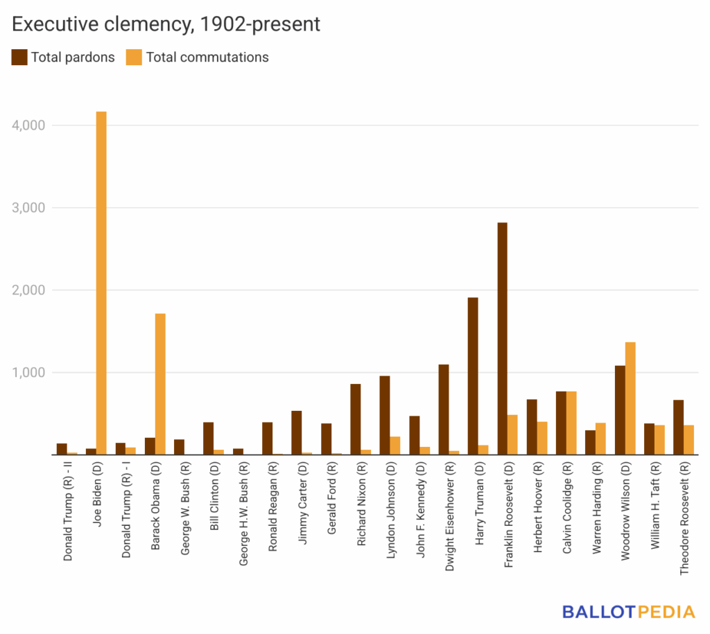 As of Nov. 9, 2025, the annual average number of pardons was 118.3, while the annual average number of commutations was 88.1. Between fiscal years 1902 and 2025, Franklin Roosevelt (D) issued, on average, more pardons than any other president (234.9 per year). During this timeframe, Lyndon Johnson (D) was the only president to issue no pardons or commutations during his final fiscal year in office.