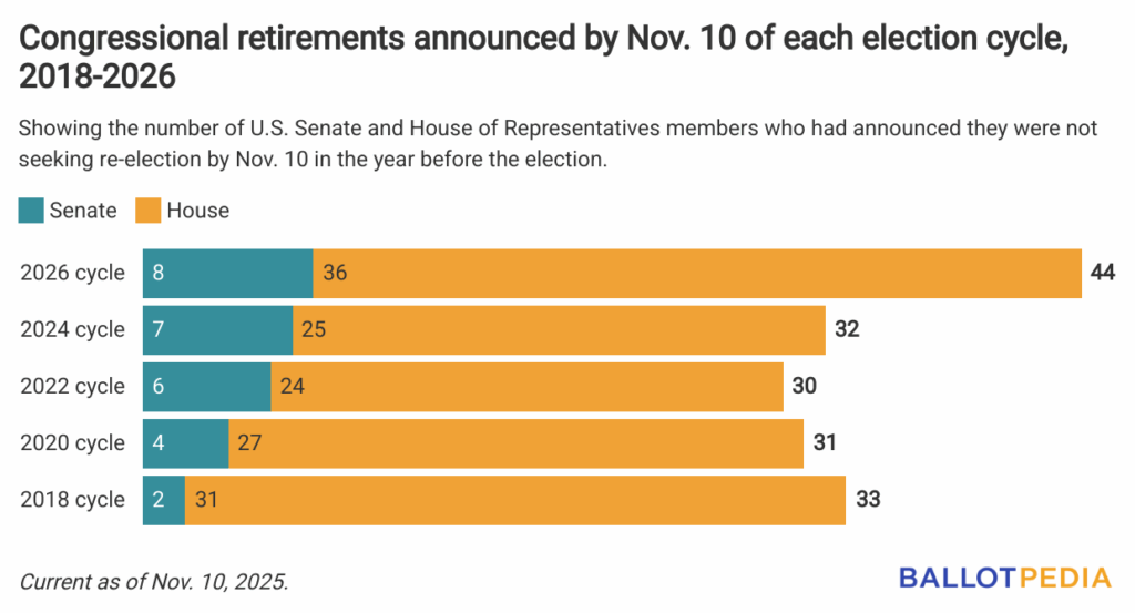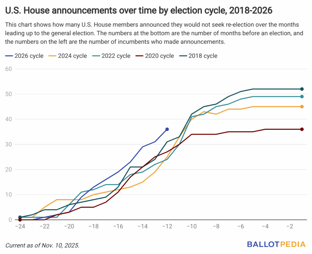 Compared to the last four election cycles, there were 25 retirement announcements at this point in 2024, 24 in 2022, 27 in 2020, and 31 in 2018.