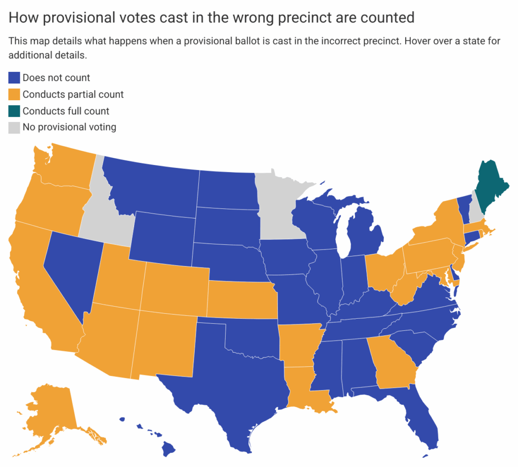 Sometimes, a voter might be directed to cast a provisional ballot if they show up at the wrong voting precinct. In 20 states, their vote will be counted in some of the races, such as federal or statewide races that are the same at every polling place. Maine fully counts provisional ballots that are cast in the wrong precinct. Twenty-six states do not count provisional ballots cast in the wrong precinct at all.
