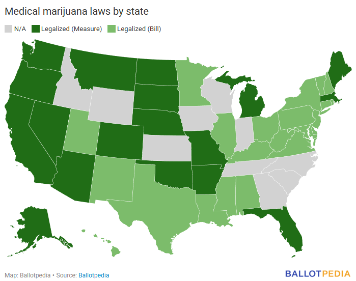 As of 2025, 40 states have medical marijuana programs, and 24 have legalized the possession and use of marijuana for recreational purposes. According to Psychedelic Alpha, as of 2025, three states (Oregon, Colorado, and New Mexico) allow the use of psychedelics for medical purposes.