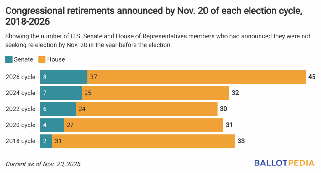 Compared to the last four election cycles, there were 25 retirement announcements at this point in 2024, 24 in 2022, 27 in 2020, and 31 in 2018.