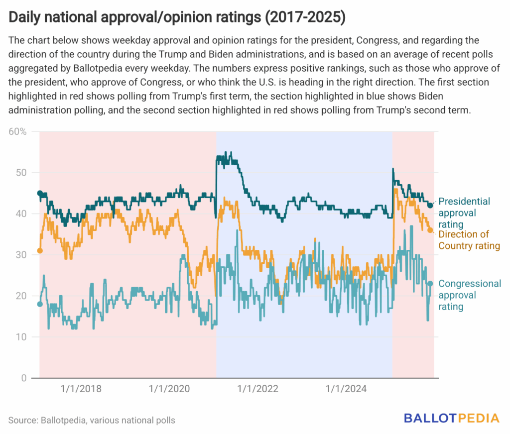 Ballotpedia’s polling index takes the average of polls conducted over the last thirty days to calculate presidential and congressional approval ratings. We average the results and show all polling results side-by-side because we believe that paints a clearer picture of public opinion than any individual poll can provide. The data is updated daily as new polling results are published.