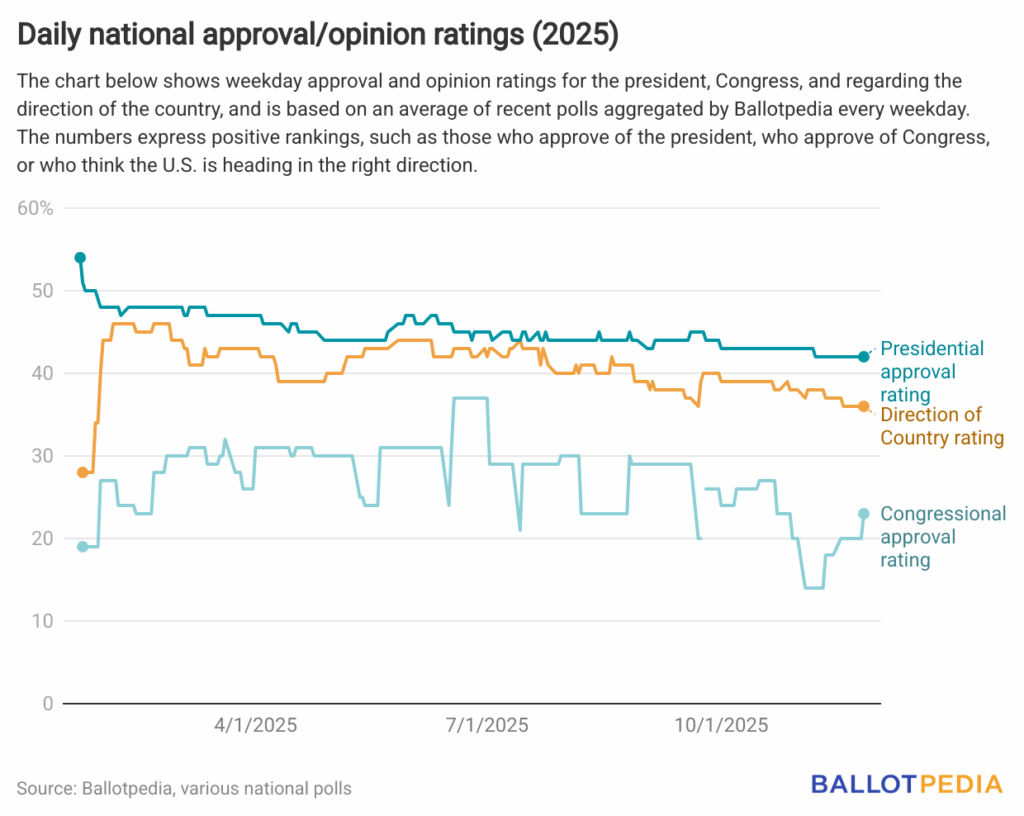 At the end of Nov., approval polling averages showed President Donald Trump (R) at 42% approval, the lowest of his second term. Fifty-five percent of voters disapproved of his performance. The highest approval rating Trump has received is 54%, last seen on Jan. 22, 2025.