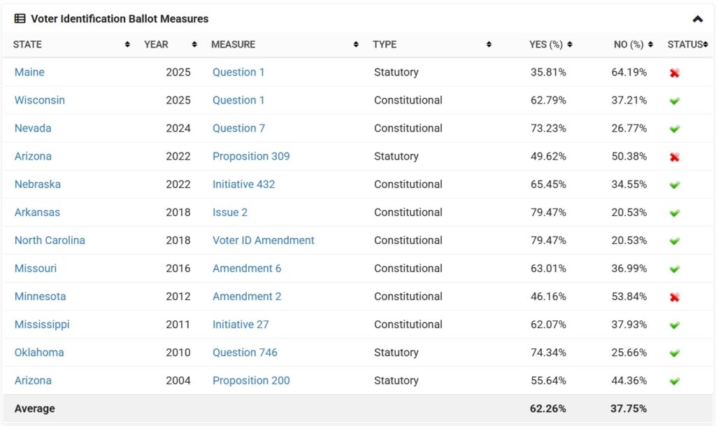 In 2025, voters in Wisconsin and Maine decided on ballot measures requiring voter identification. In Wisconsin, 62.8% of voters approved Question 1, which required voters to provide a valid photo ID to cast a ballot.