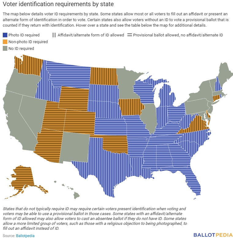 As of 2025, 36 states require voters to present identification to vote at the polls on Election Day. Of these states, 24 require voters to present identification containing a photograph, with certain exceptions, and 12 states do not explicitly require photo identification. The remaining 14 states generally do not require voters to present identification to vote at the polls.