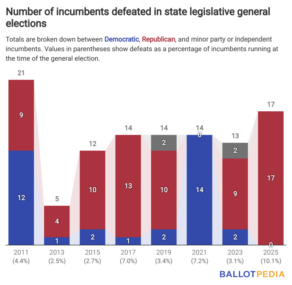 Seventeen incumbents—all Republicans—lost in the 2025 state legislative elections in New Jersey and Virginia. That’s the most general election incumbent defeats in an odd year since 21 were defeated in 2011.