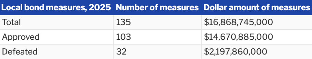 Of the 322 local measures, 135 addressed bonds, including city, district, and local school bonds. Bond measures ask voters whether the government can borrow money by issuing bonds that will be repaid, with interest, over a set period. Of the 135 bond measures, 103 were approved, and 32 were defeated. In total, $14.6 billion was approved.