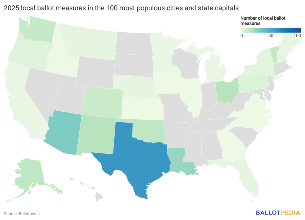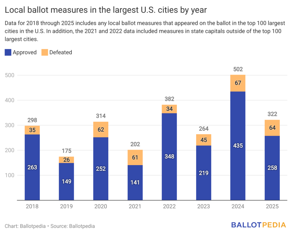 In 2025, 322 local measures appeared on ballots in the top 100 largest cities in the U.S. and in state capitals. This included citywide measures, countywide measures, special district measures, and school district measures.