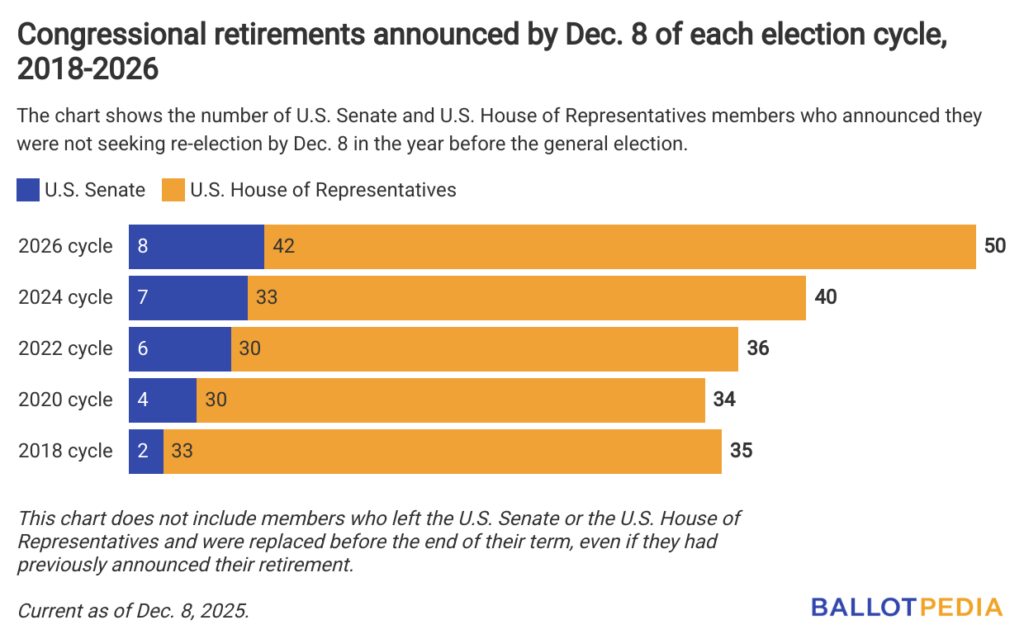 At this point in the last four election cycles, there were 33 retirement announcements in 2024, 30 in 2022, 30 in 2020, and 33 in 2018.