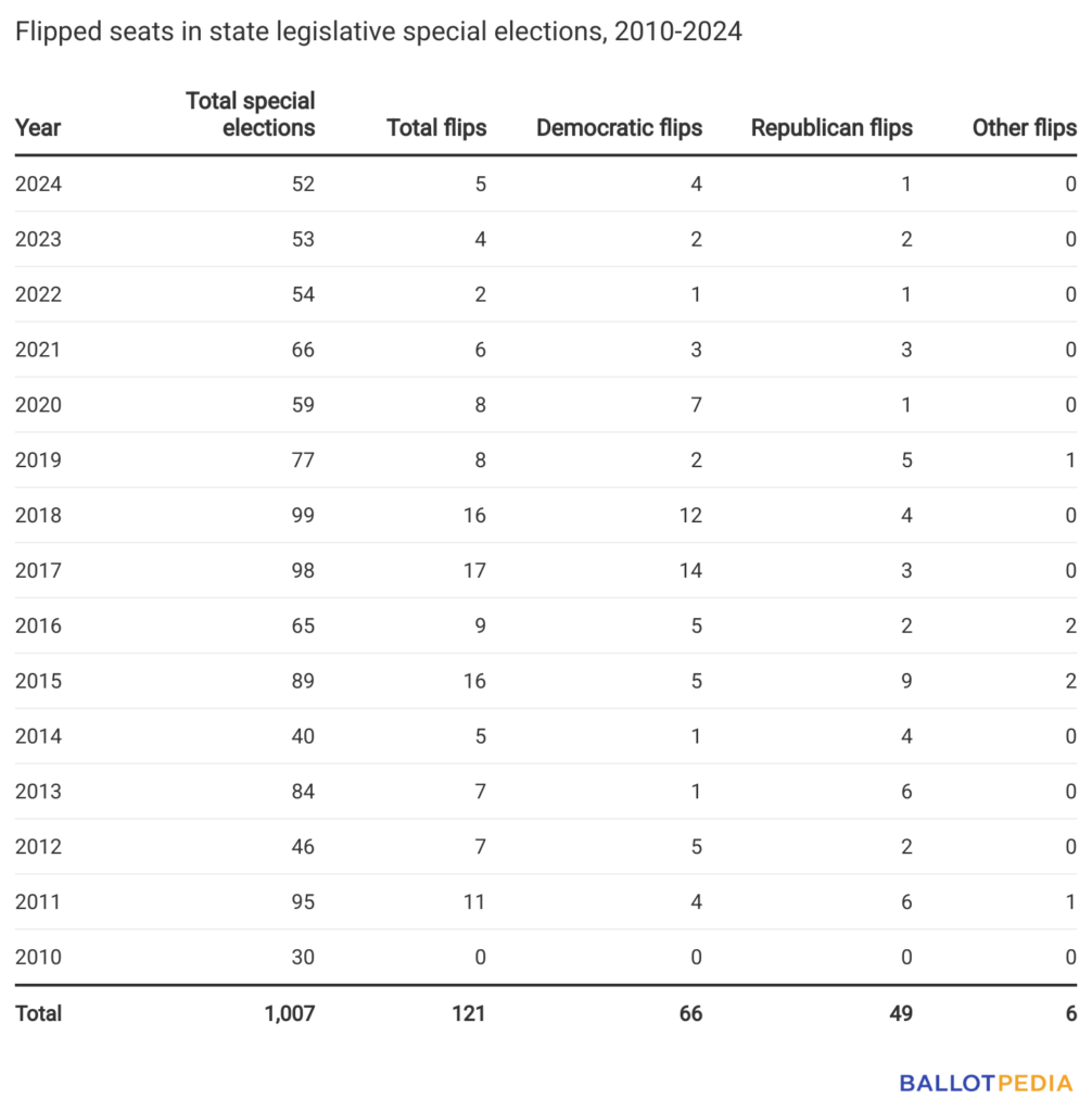 Between 2010 and 2024, 121 special elections resulted in changes in partisan control of state legislative seats.