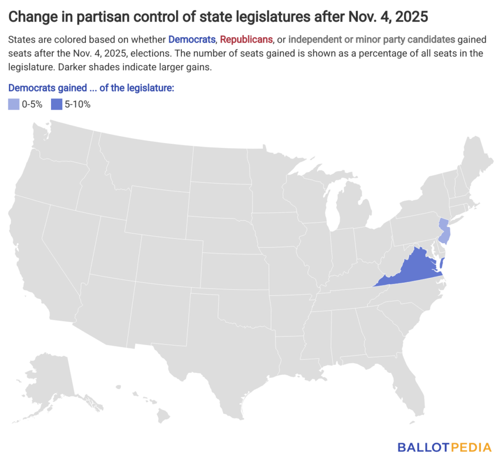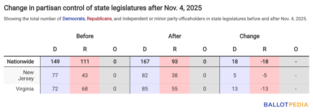 As a result of the Nov. 4, 2025, elections, the partisan composition of the 180 state legislative seats up for election changed by 10 percentage points. That is compared to a one percentage point shift following the 2023 elections.