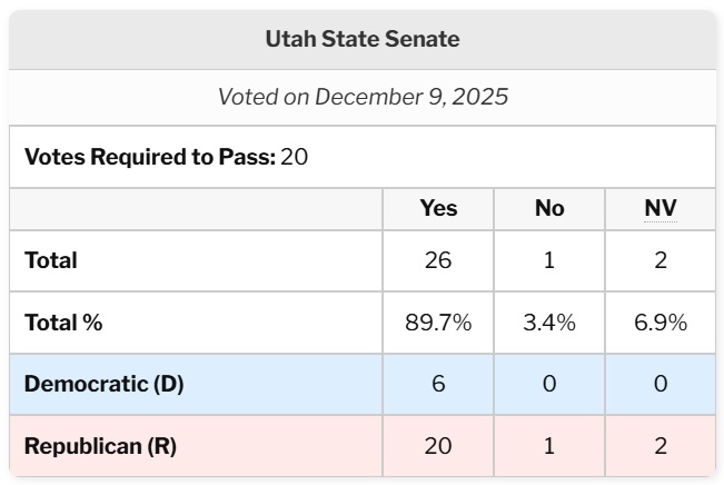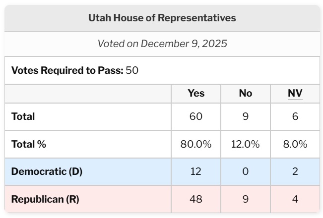 On Dec. 9, 2025, the Utah State Legislature passed House Bill 2001 (HB 2001), which repealed HB 267. The state House passed HB 2001 in a vote of 60-9, with six representatives not voting. Twelve Democrats and 48 Republicans voted yes, and nine Republicans voted no. Two Democrats and four Republicans were absent or otherwise not voting.