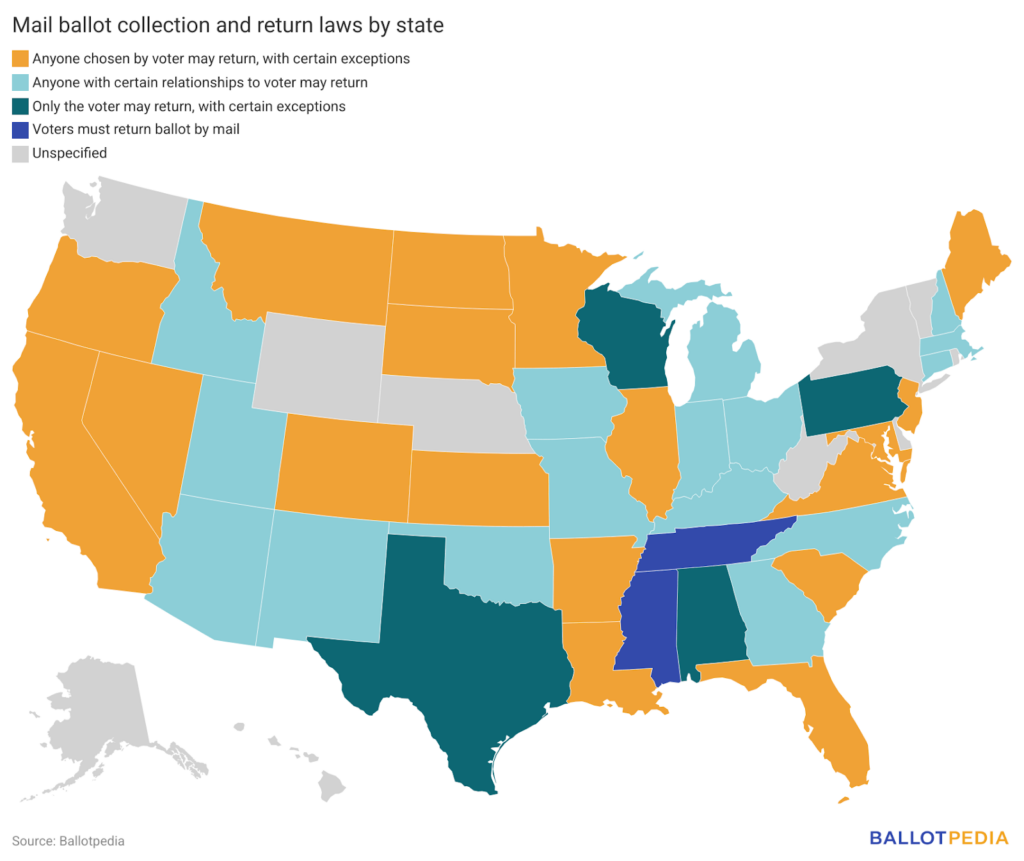Forty states have laws specifying who can return an absentee/mail-in ballot. Politicians, advocacy groups, and researchers use a variety of terms when discussing these types of laws, including ballot harvesting, community ballot collection, ballot gathering, third-party possession of another's ballot, and ballot return.