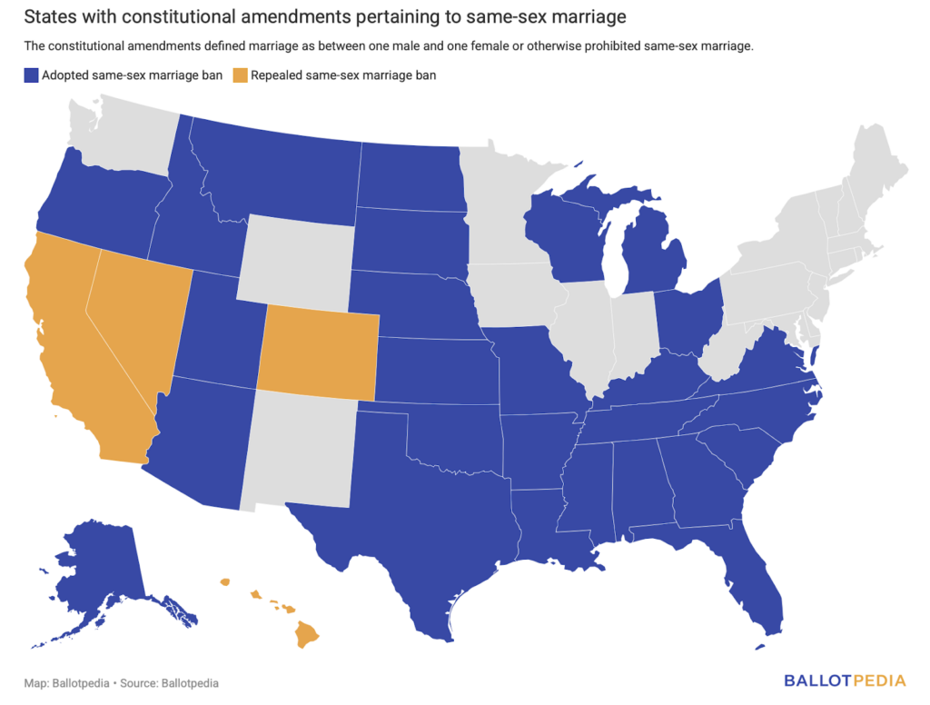 Between 1994 and 2012, 30 states decided on 34 measures to define marriage as between a man and a woman or prohibit same-sex marriage. Thirty-one were approved, and three were defeated. Between 2020 and 2024, California, Colorado, Hawaii, and Nevada voted to repeal previously approved measures banning same-sex marriage.