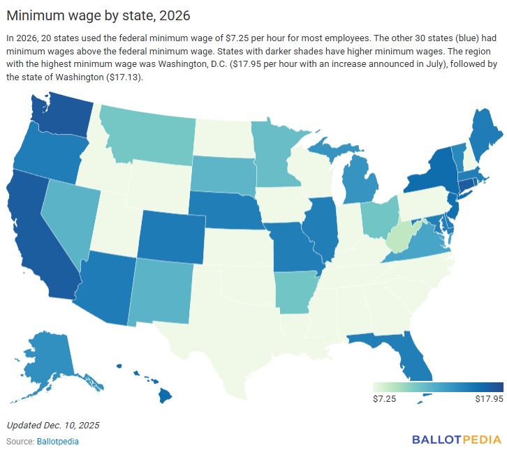 The minimum wage is the lowest in Georgia and Wyoming, where the $5.15 minimum wages are superseded by the federal government’s $7.25 per hour requirement. Going into 2026, 20 states used the federal minimum wage of $7.25, and 30 states set state minimum wages above the federal minimum.