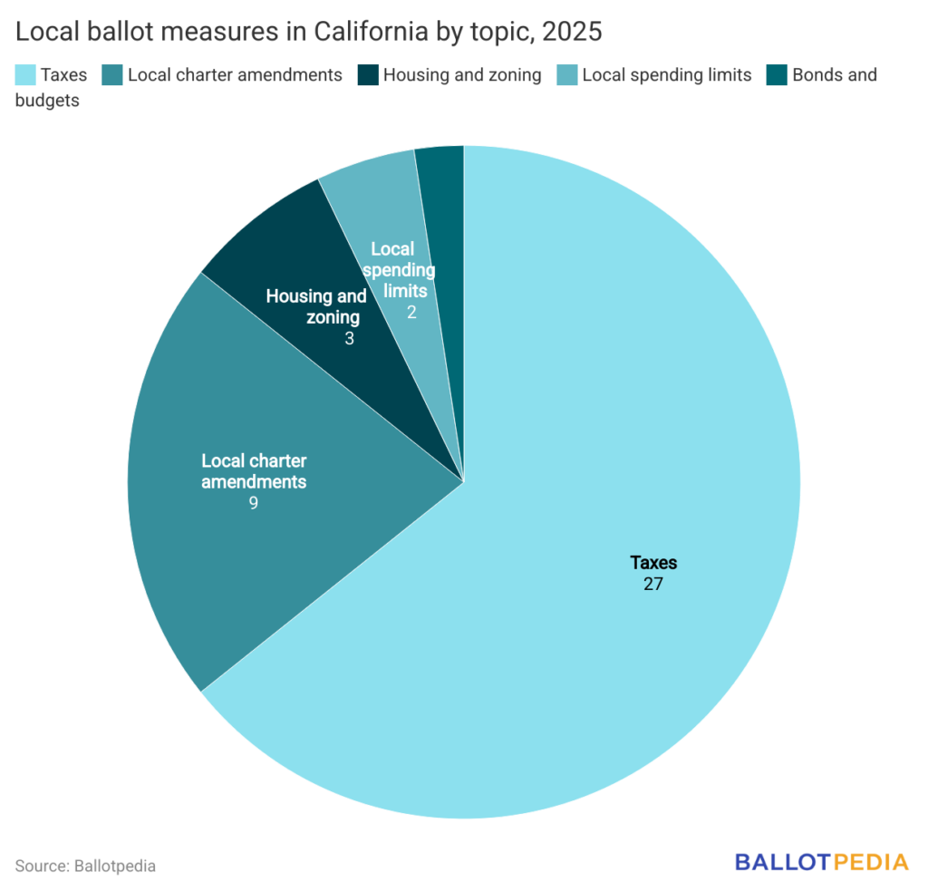 Of the 42 local ballot measures, 27 were tax-related, accounting for approximately 64% of all local ballot measures in California in 2025. Out of the other measures, nine (21%) were related to charter amendments, three (7%) were related to housing, two (5%) were related to local spending limits, and one (2%) was related to bonds.