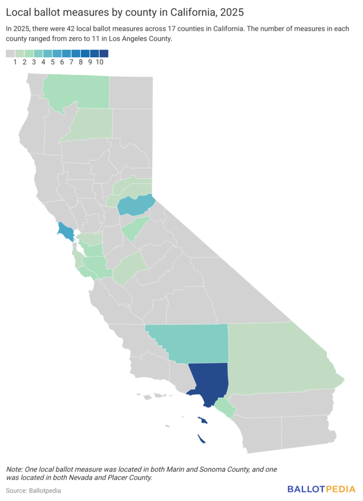 Voters in 17 of 58 counties decided on local measures in 2025, with Los Angeles County voting on the most, with 11 measures on the ballot. The county with the second-most ballot measures was Marin County, with five.