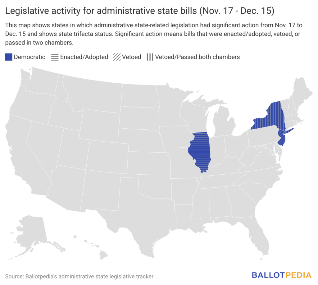 Since our last newsletter edition, Ballotpedia tracked significant legislative action (enactments, vetoes, and passage through both chambers) in three states on four bills related to the administrative state. Illinois Gov. J.B. Pritzker (D) signed one bill, and both houses of the New York legislature passed one bill. New York Gov. Kathy Hochul (D) and New Jersey Gov. Phil Murphy (D) each vetoed a bill. Ballotpedia has tracked a total of 2,312 bills related to the administrative state in 2025 as of Dec. 15.