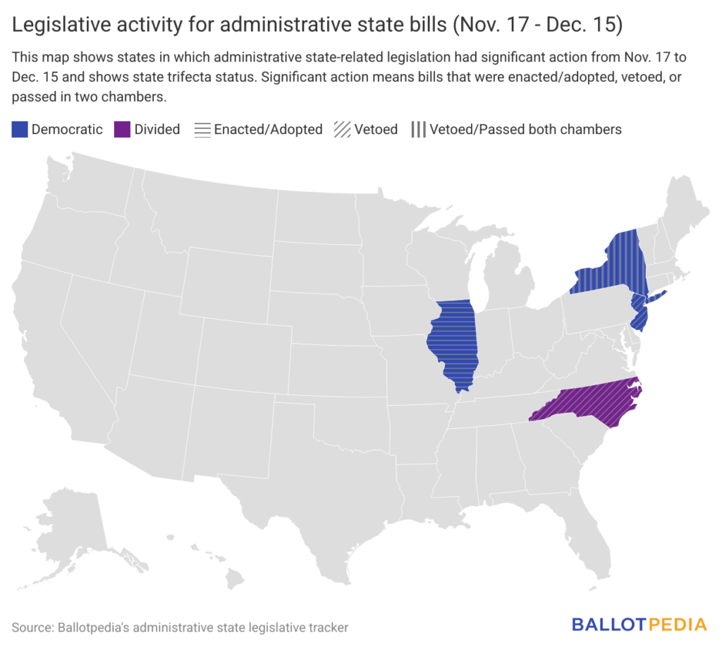 Since our last newsletter edition, Ballotpedia tracked significant legislative action (enactments, vetoes, and passage through both chambers) in four states on six bills related to the administrative state. Illinois Gov. J.B. Pritzker (D) signed one bill, and both houses of the New York legislature passed one bill. New York Gov. Kathy Hochul (D) and New Jersey Gov. Phil Murphy (D) each vetoed a bill, and North Carolina Gov. Josh Stein (D) vetoed two bills.