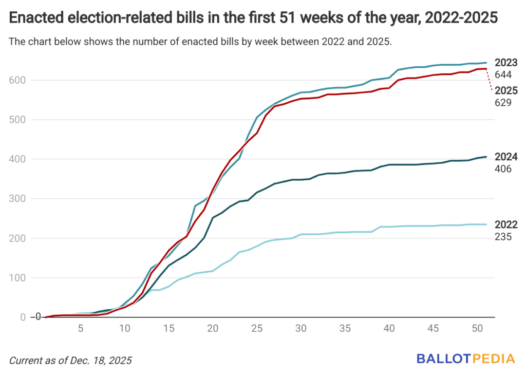 This week, in addition to our usual weekly update, we're reviewing the election-related bill activity over the course of this year. We’ve tracked nearly 5,000 election-related bills and resolutions in 2025—surpassing the total number of bills in any year since we began tracking election legislation in 2022.