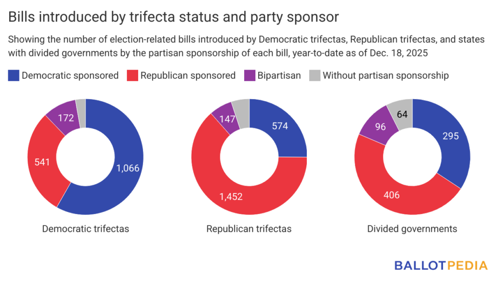 - Note: Indiana began its 2026 legislative session on Dec. 1. Between Dec. 1 and Dec. 18, there were 13 bills introduced in the Indiana General Assembly related to elections. The numbers above only include legislation from 2025 sessions.