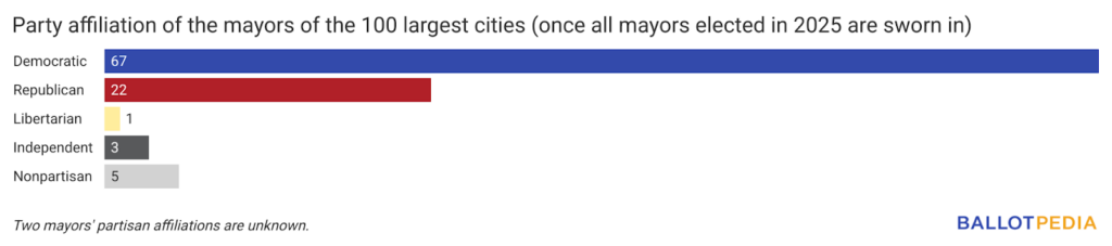 The following chart shows what the partisan breakdown of mayors in the top 100 most populous U.S. cities will be once all mayors elected in 2025 are sworn in.