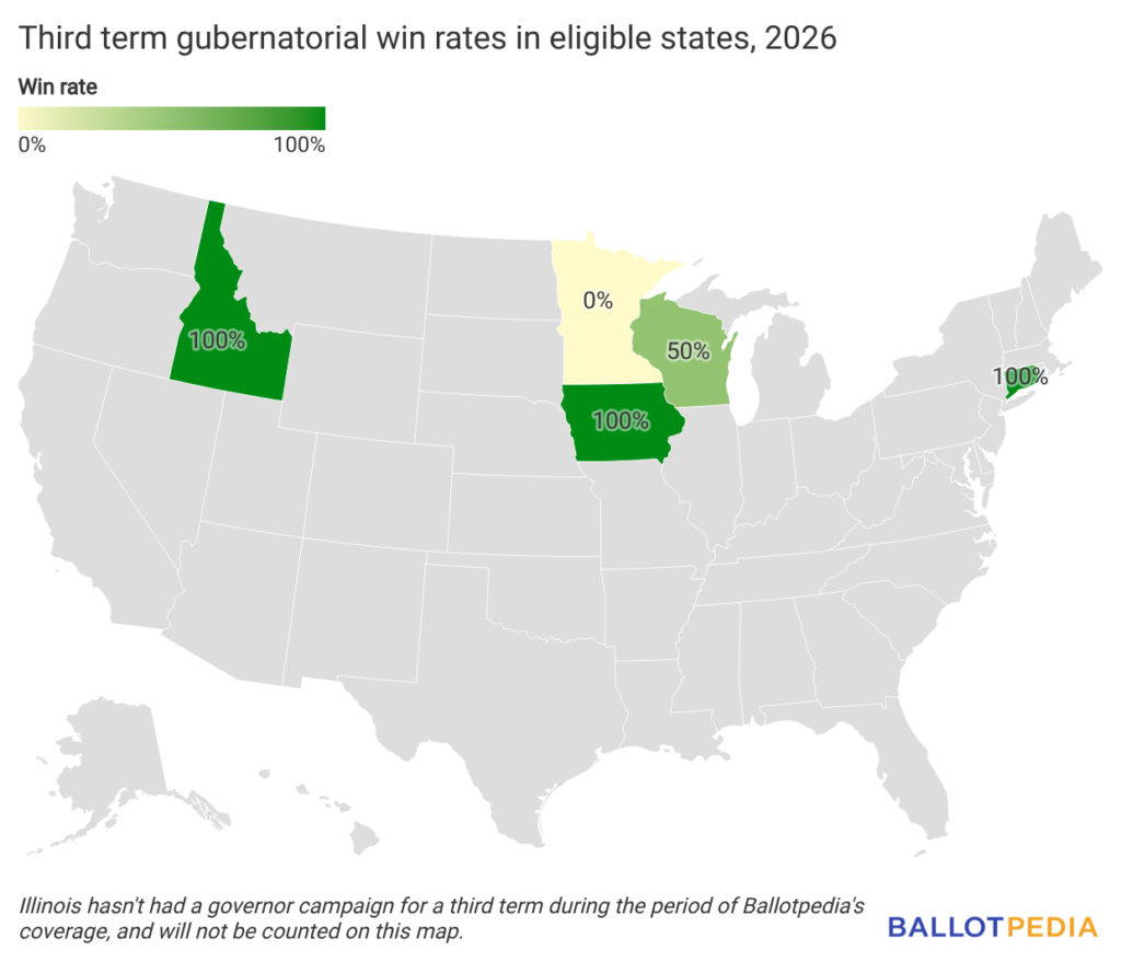 Of the six states in 2026 where a governor is eligible to run for a third term, since 1986, a governor has done so in five of the six states. Pritzker is the first Illinois governor to run for a third consecutive term in this period.
