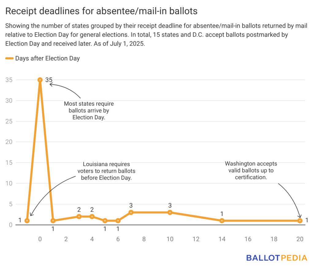 More states joined this group in 2025, with four states enacting laws requiring absentee/mail-in ballots to be received by the close of polls on Election Day. Those states are Kansas, North Dakota, Ohio, and Utah. North Dakota, Ohio, and Utah have Republican trifectas. In Kansas, the Republican-controlled Legislature overrode Democratic Gov. Laura Kelly’s veto.
